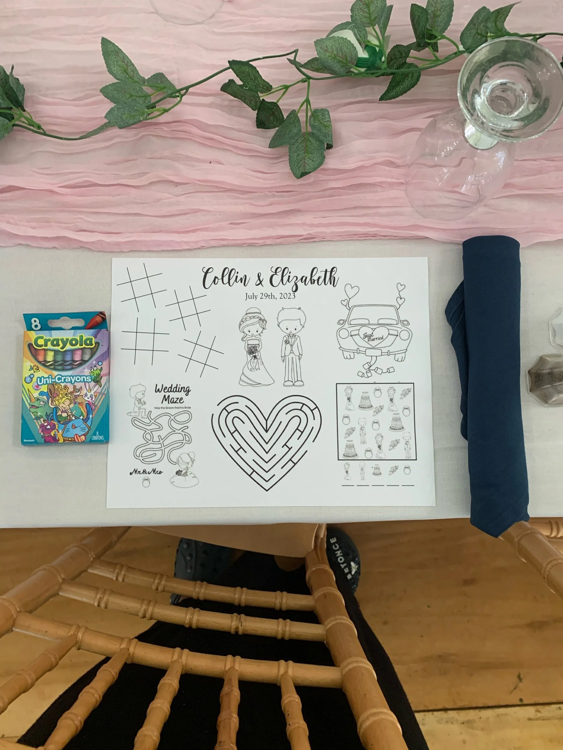Pick up to 5 activities to put on your custom activity sheet! Even add an outline of the bride and groom for the guest to color in.